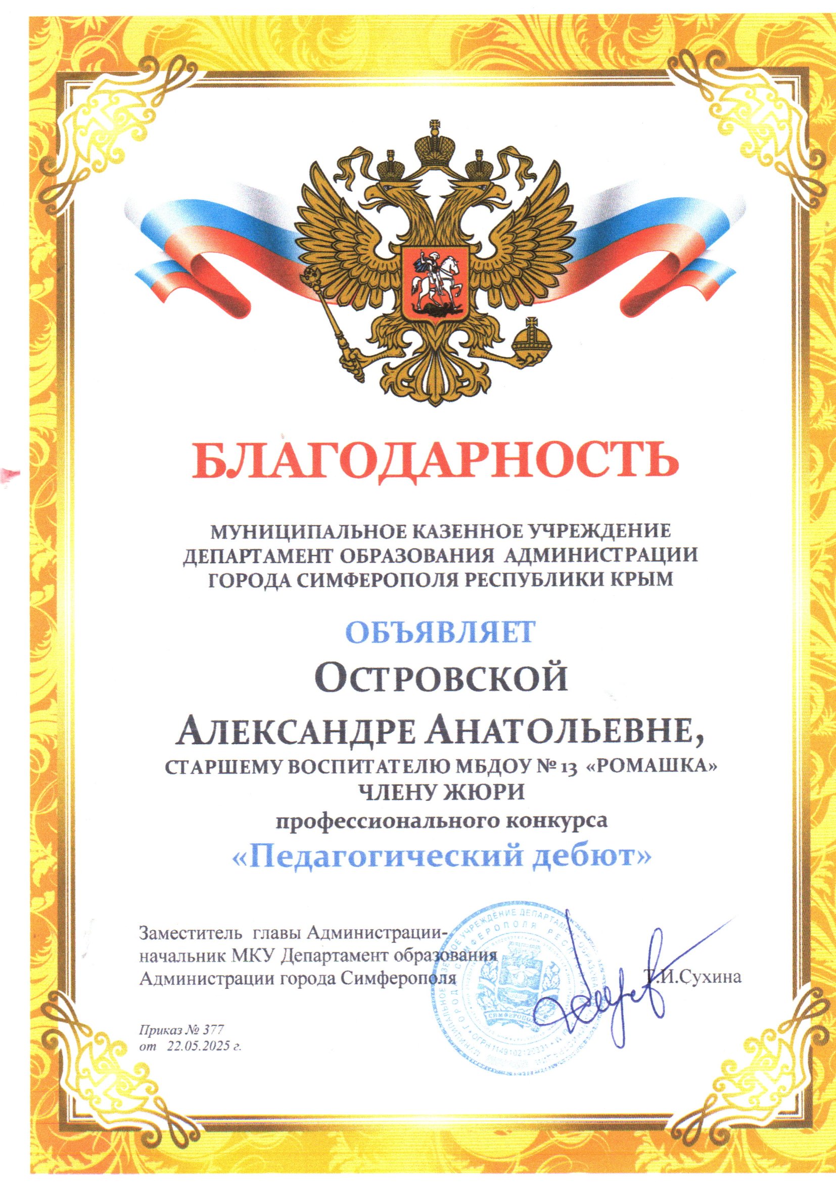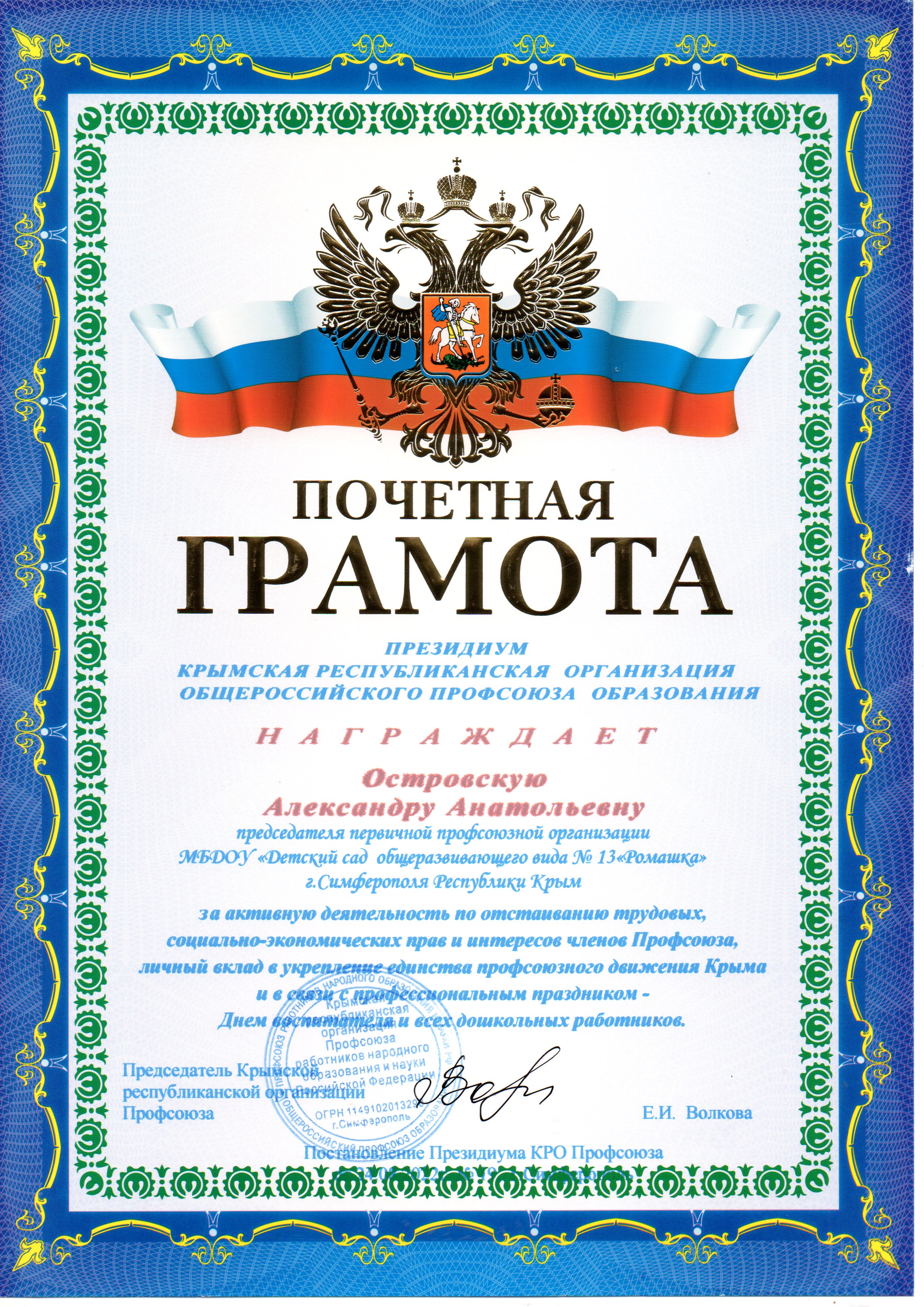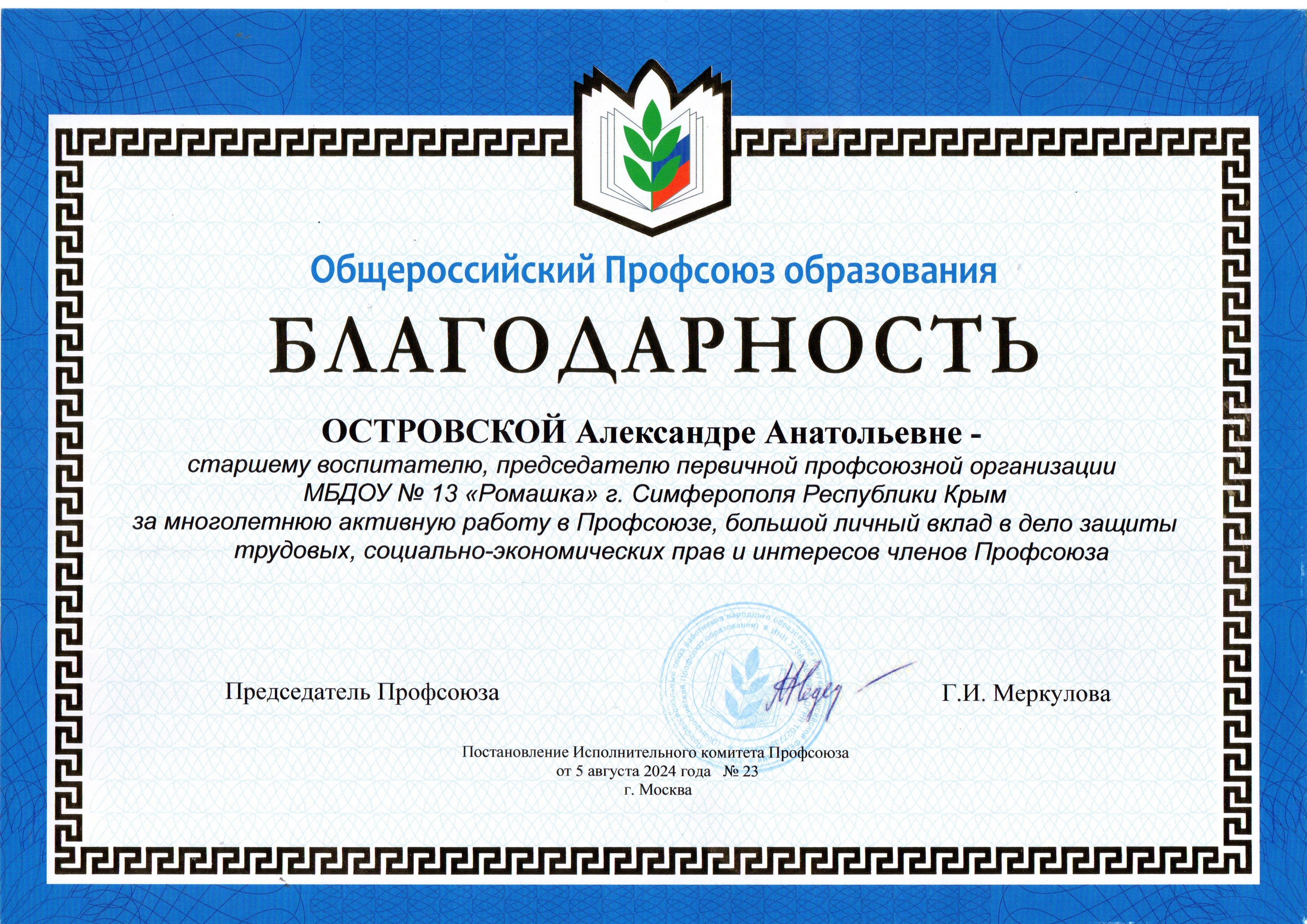 Сведения о повышении квалификации - ГБОУ ДПО РК "КРИППО" по программе "Теория и практика организации деятельности и управления дошкольным образовательным учреждением" , 2024